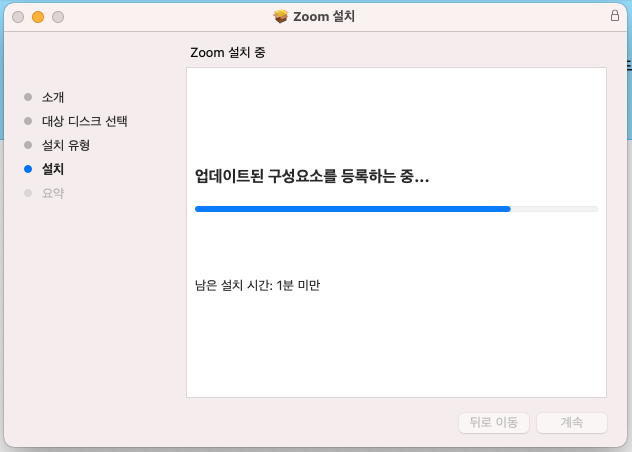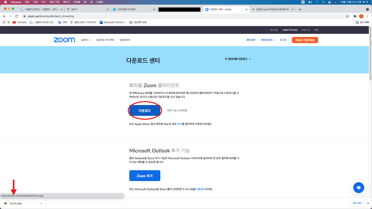 "회의용 Zoom 클라이언트"에서 다운로드를 누르면 왼쪽 아래에서와 같이 설치 프로그램이 다운로드 됩니다.